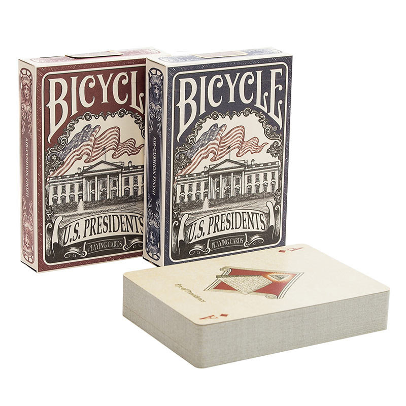 Bicycle US Presidents подойдут в качестве подарка дорогому человеку, благо внешний вид тут изумительный. Они выполнены в стандартном размере, поэтому тем, кто уже обладает определенной привычкой в удержании рукой, не должен будет переучиваться. Упаковка выполнена из прочного картона, который будет защищать карты во время перевозки от случайных падений, попадания пыли и грязи и других негативных воздействий. Не забывайте положить их в сумку или карман, когда отправляетесь на вечеринку – друзья точно будут рады этому и решат устроить несколько ожесточенных партий.
